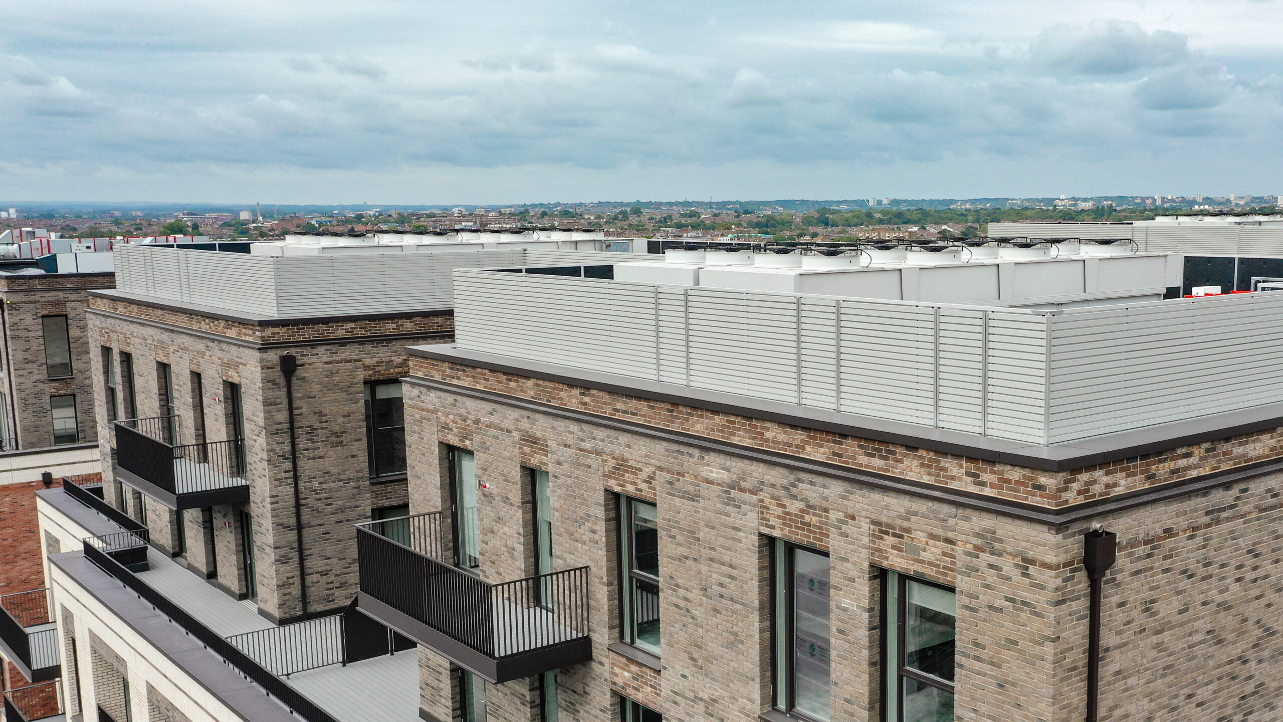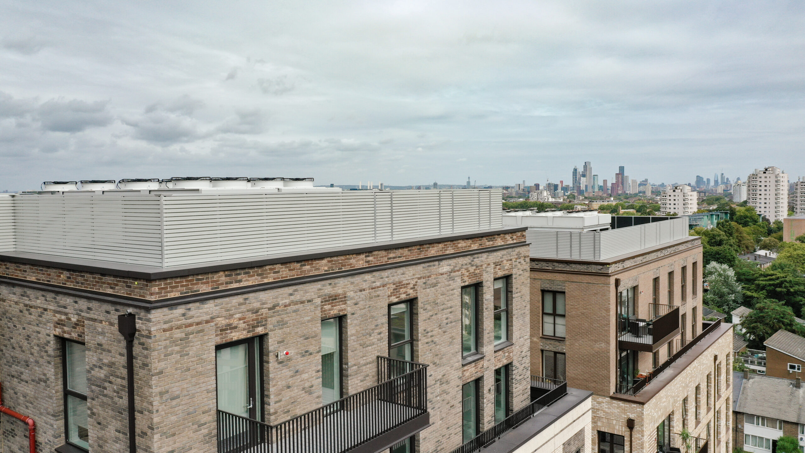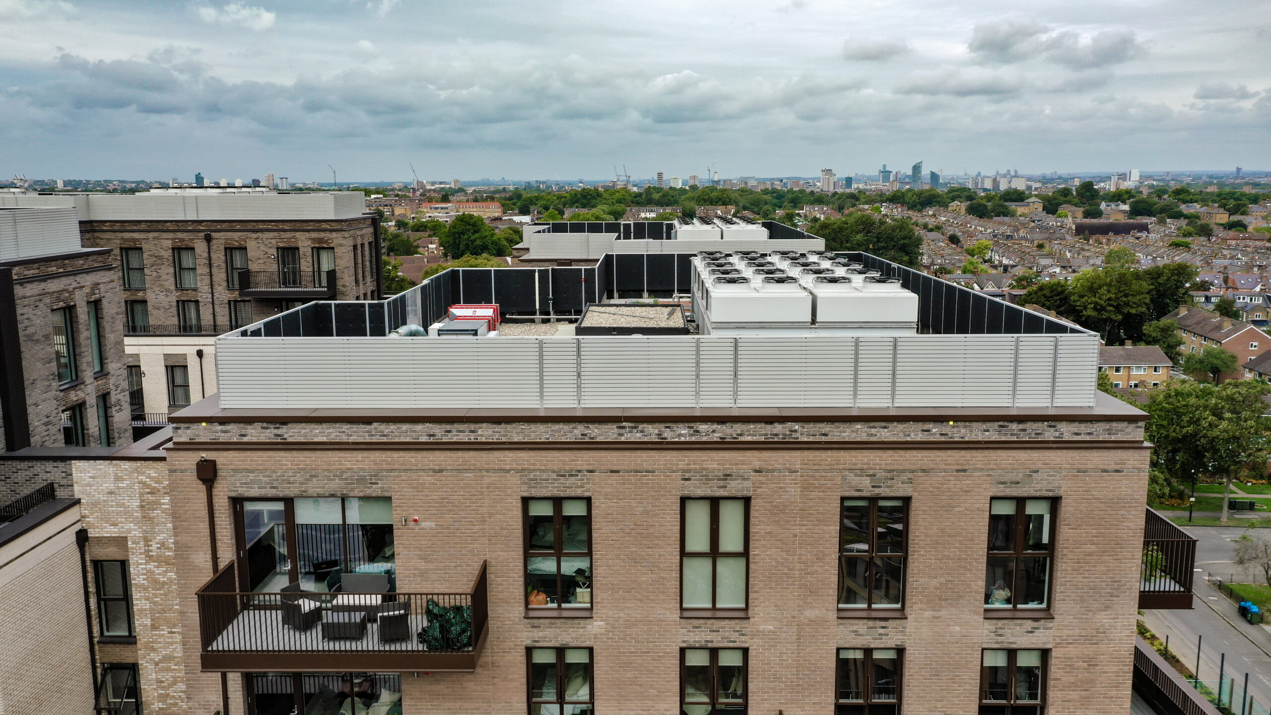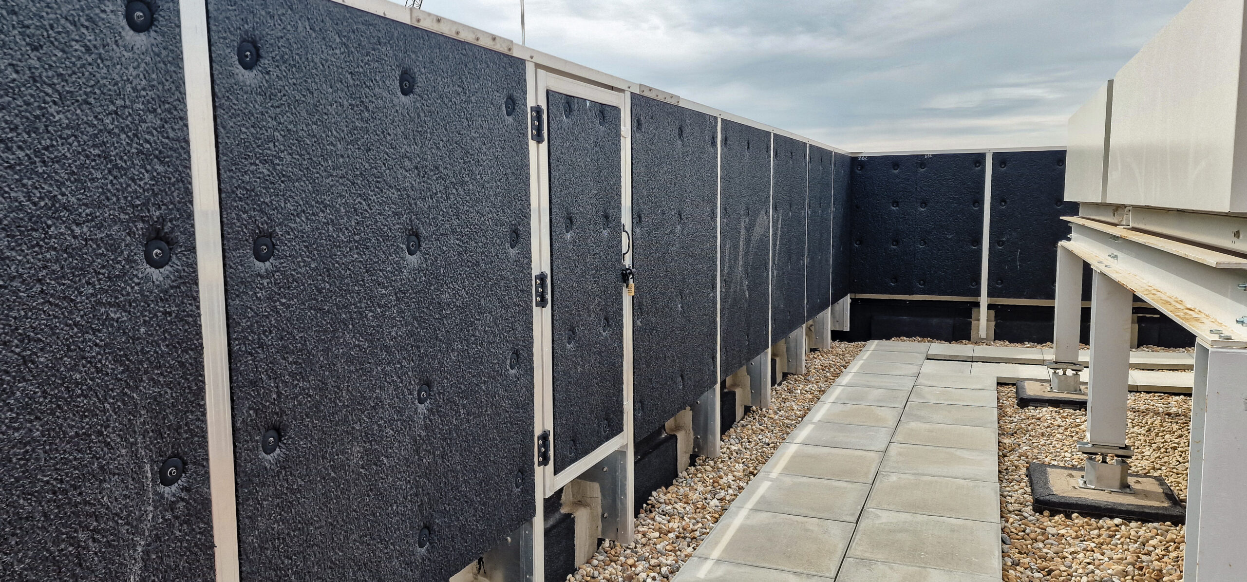inside of the parapet using our Parascreen system. The design process ensured both visual harmony and effective acoustic performance, screening rooftop chiller units from view and noise.