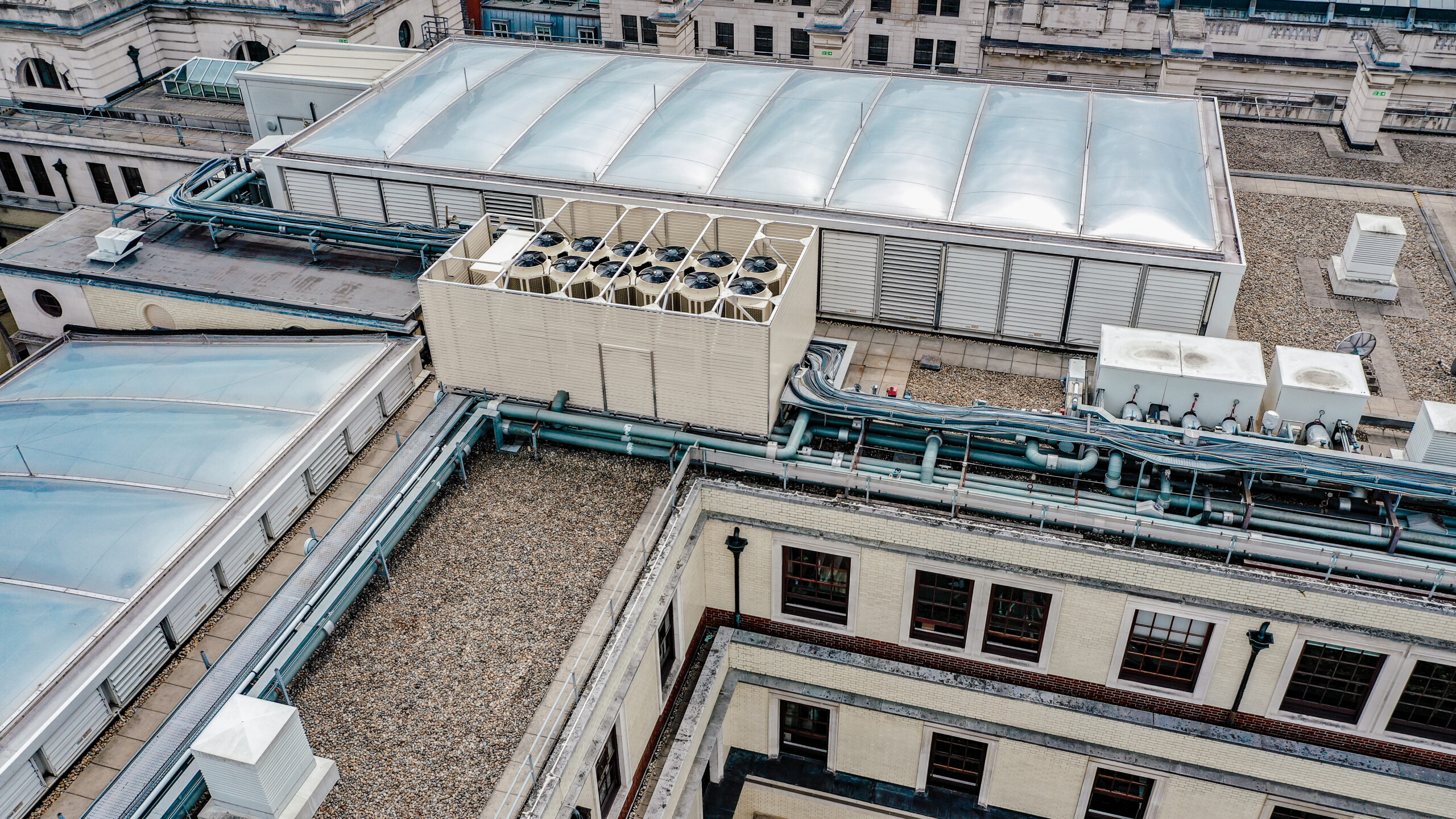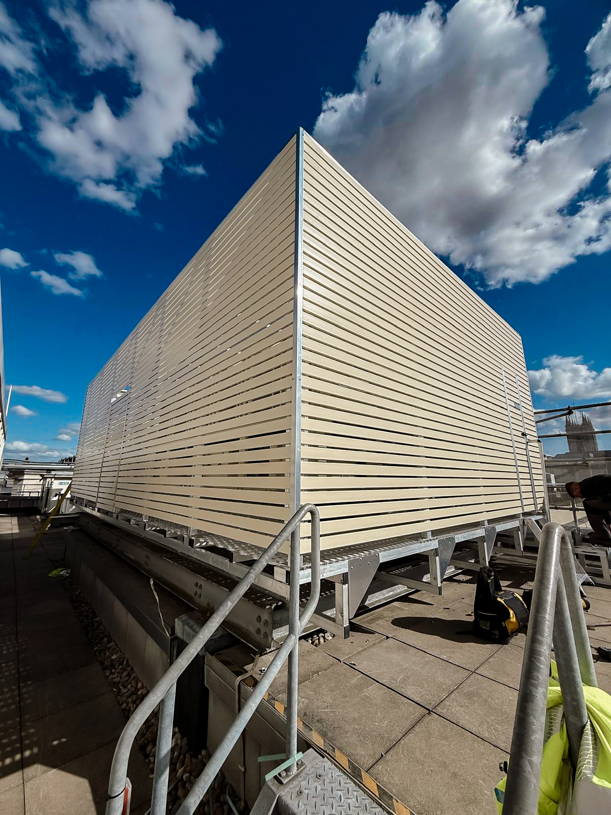 The solution was designed by our in-house design team, who worked closely with the wider project stakeholders to ensure the enclosure met all relevant building and design requirements. Through clear communication and coordination, the team delivered a fully compliant design that integrated seamlessly with the existing architecture and overall building aesthetic. Additionally, the non-penetrating design provided a secure base for the chiller units without requiring any roof penetrations, reducing the risk of roof leaks and simplifying the installation process.