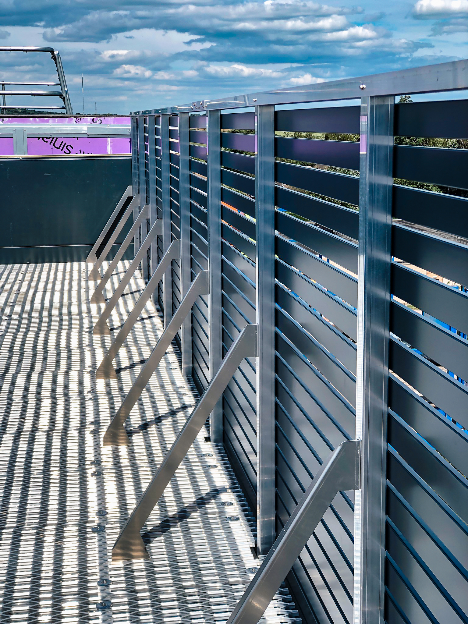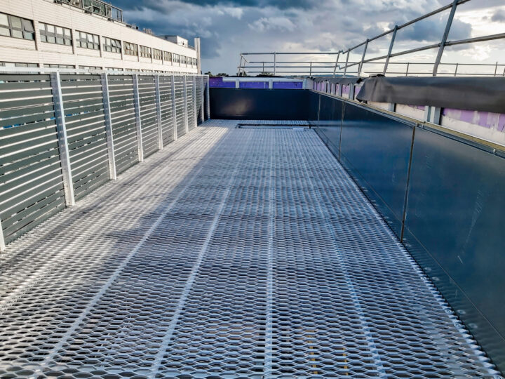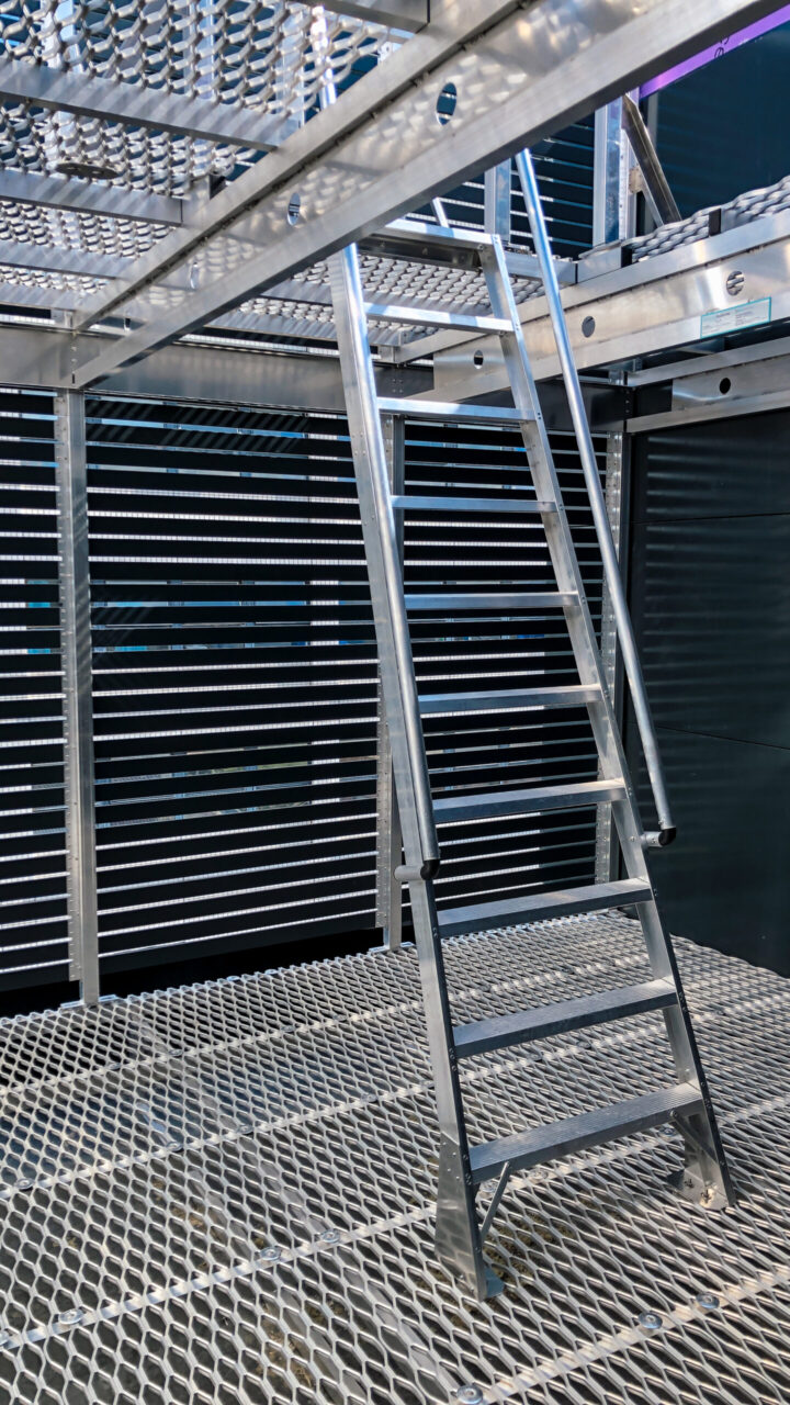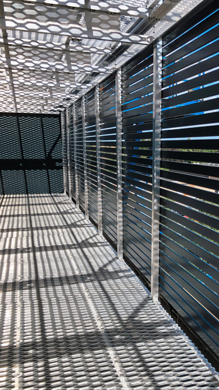 This solution maximized the use of limited space by incorporating a mezzanine level accessed via a hand railed step ladder. Our I-Bearer beam was utilized to provide a clear-spanning structural element, ensuring both strength and efficiency. The standard screens were continuous on the outside making a very tidy finish and screening off the equipment on both levels.