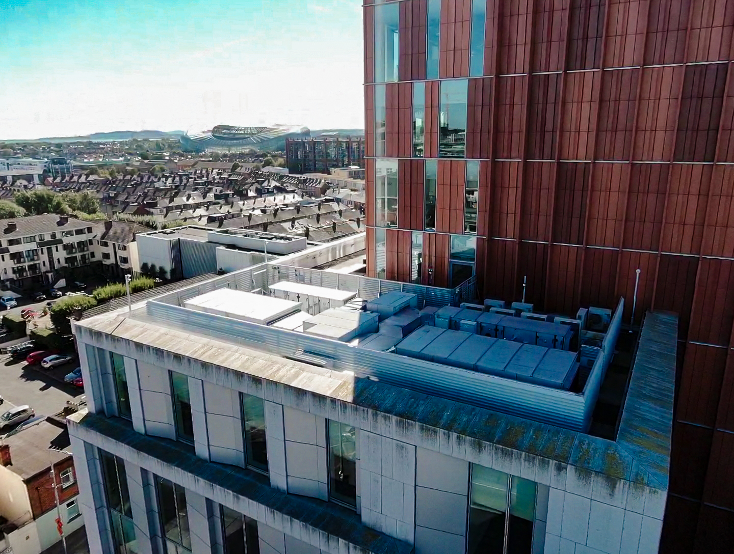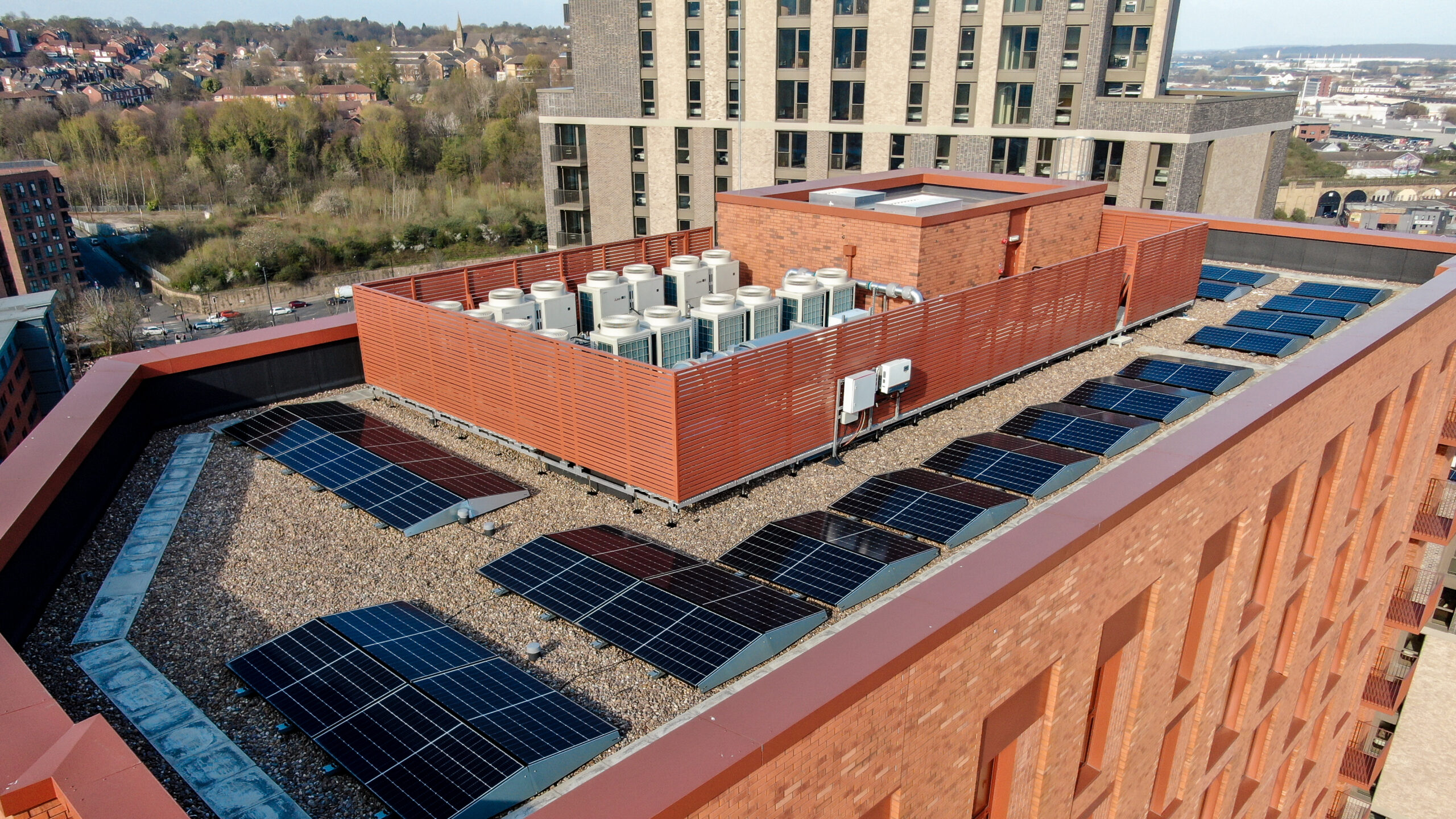 – Ballast weighted Speedscreen system to visually screen off the equipment from a roof terrace with no roof penetrations.