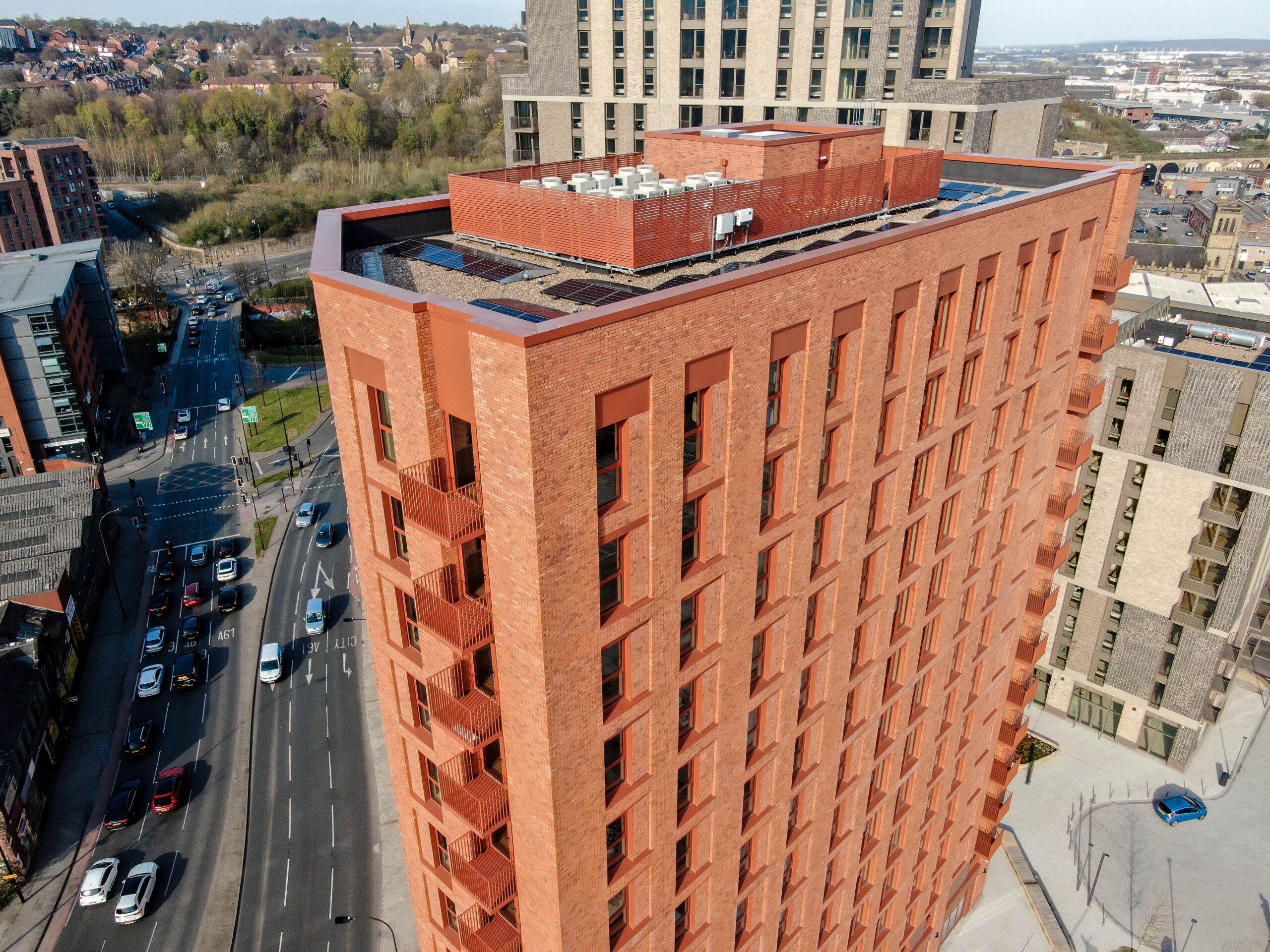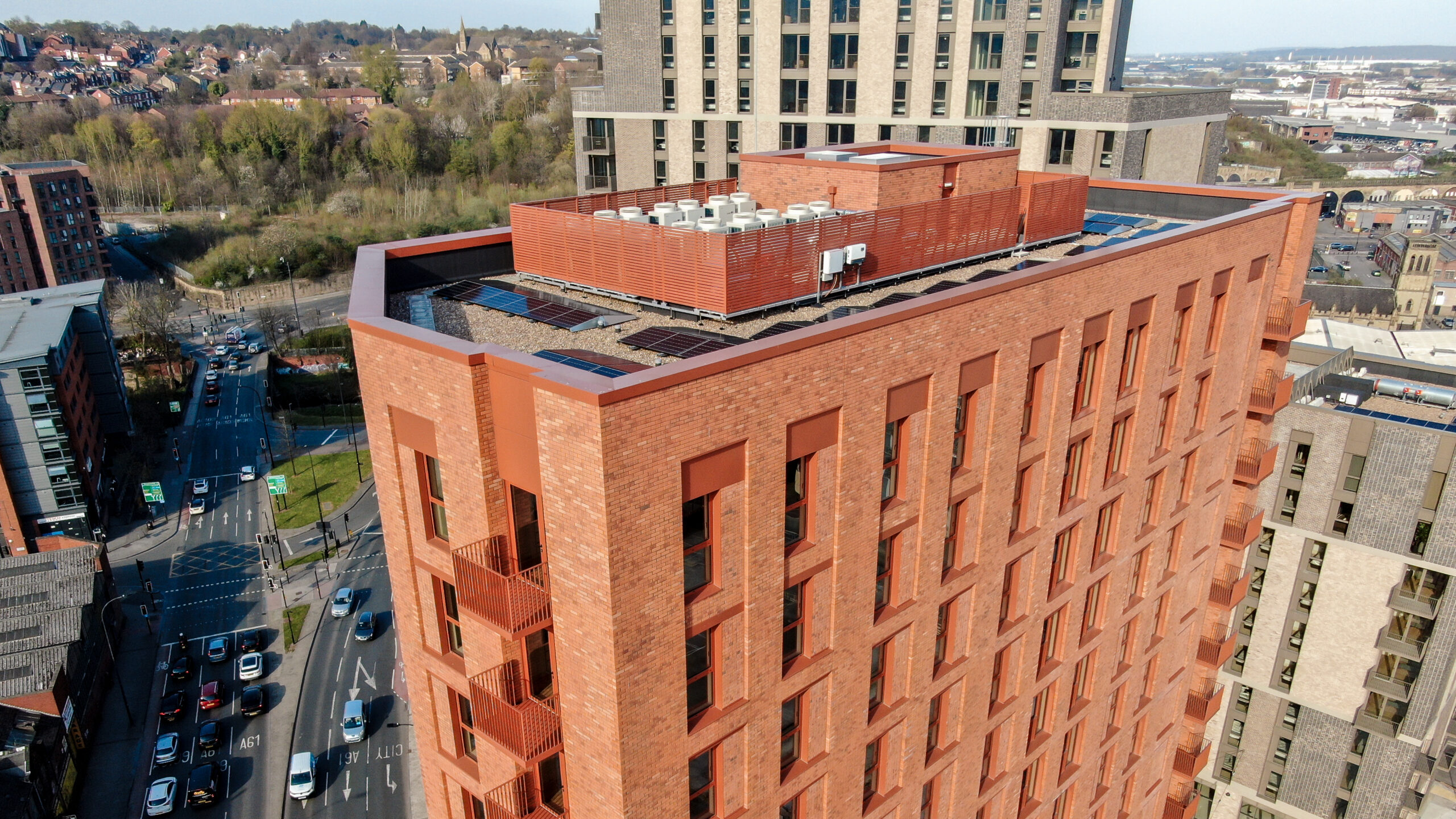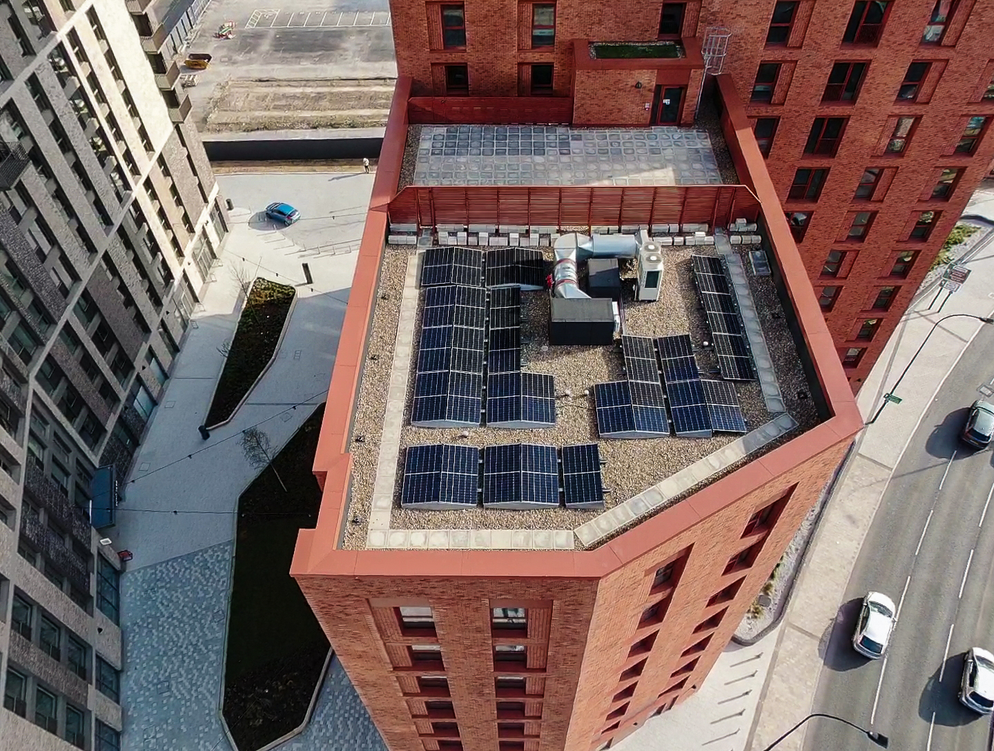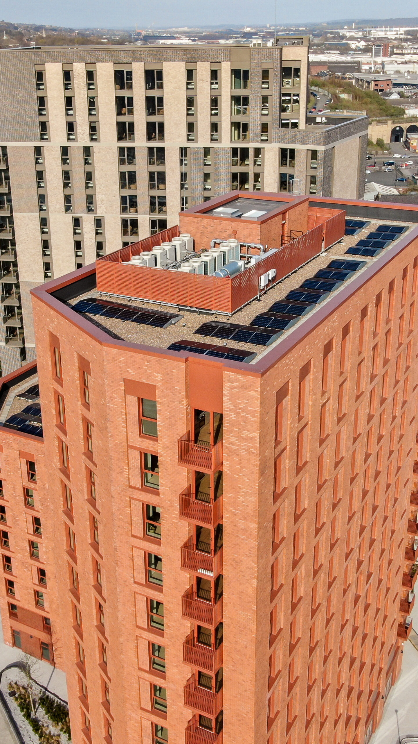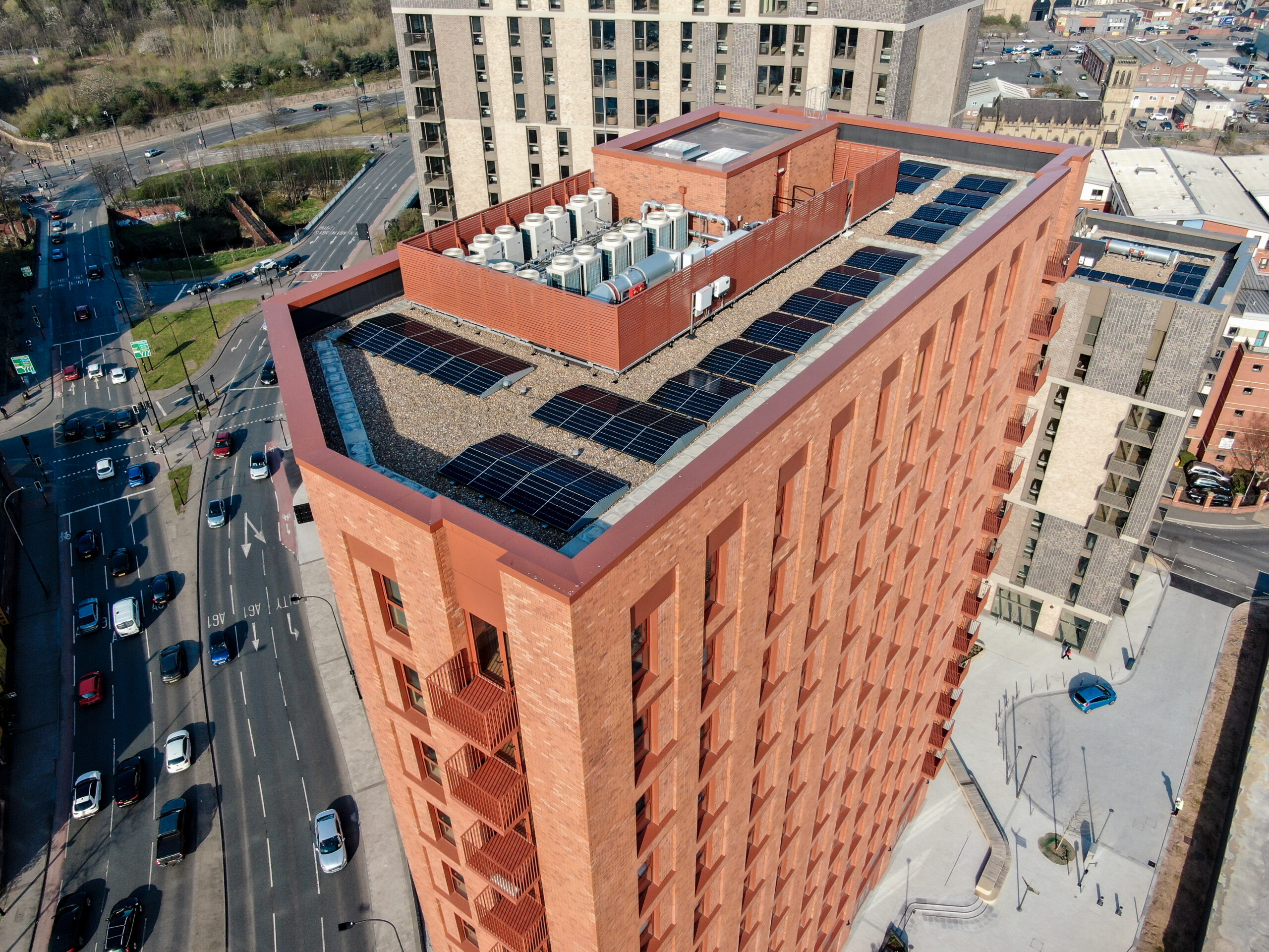 Installation could be completed efficiently on top of a finished roof buildup without affecting or penetrating the waterproofing layer, thanks to the modular design. The systems were prefabricated in our factory in Leeds and delivered flat-packed to site, allowing for rapid assembly with minimal on site disruption.