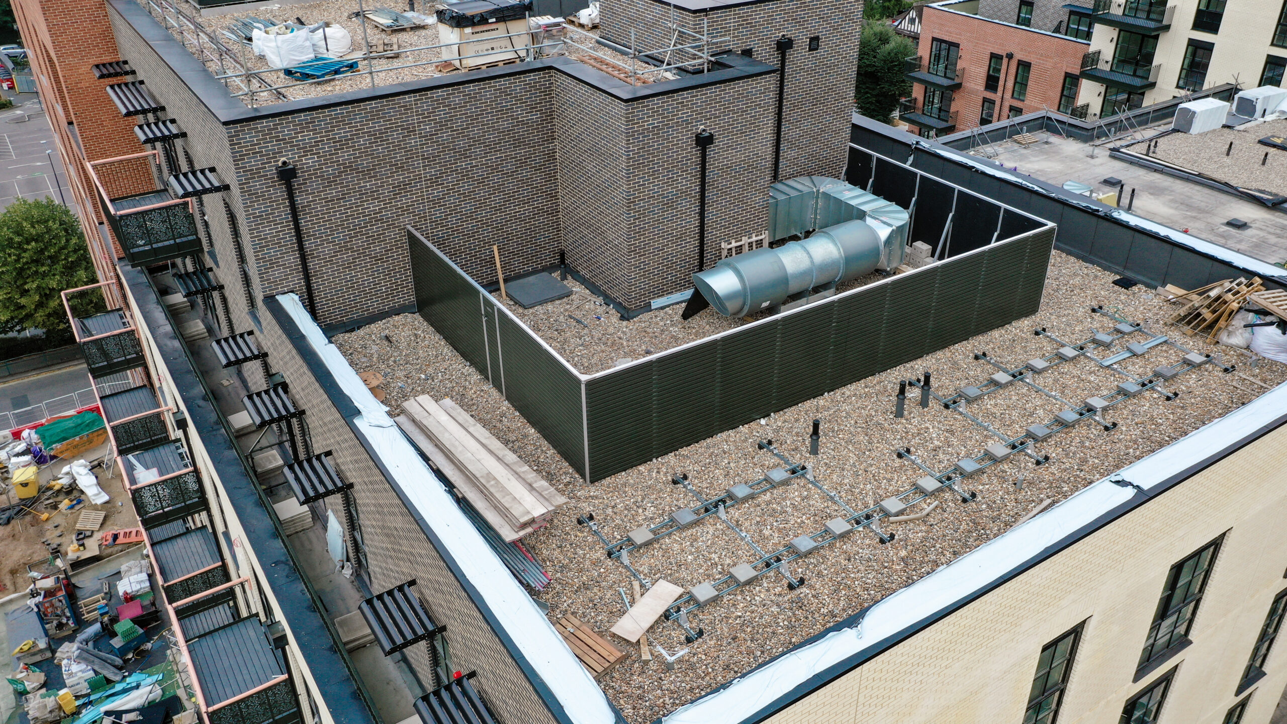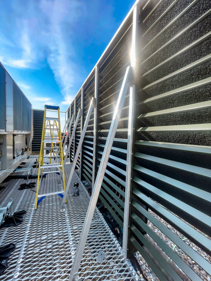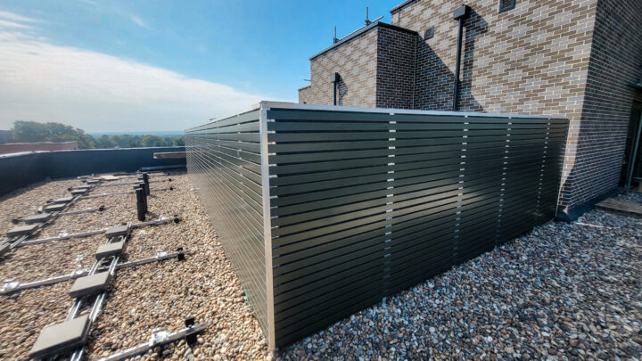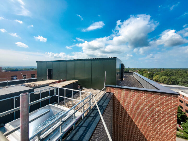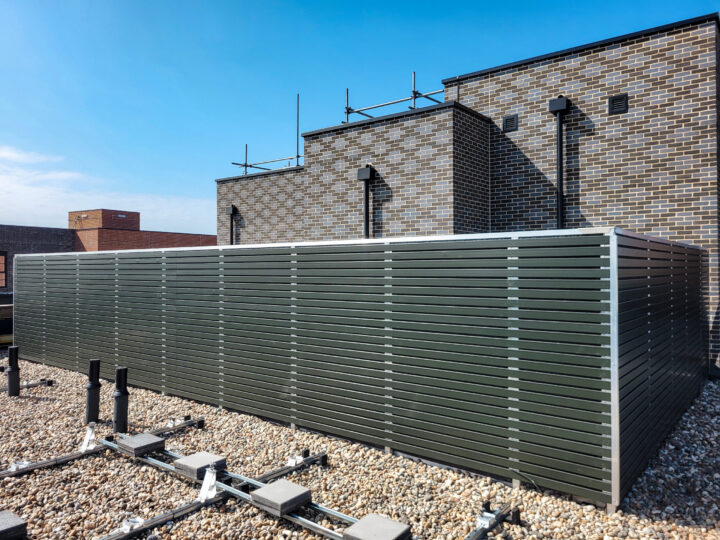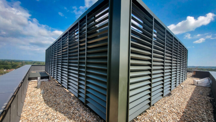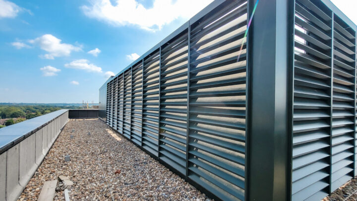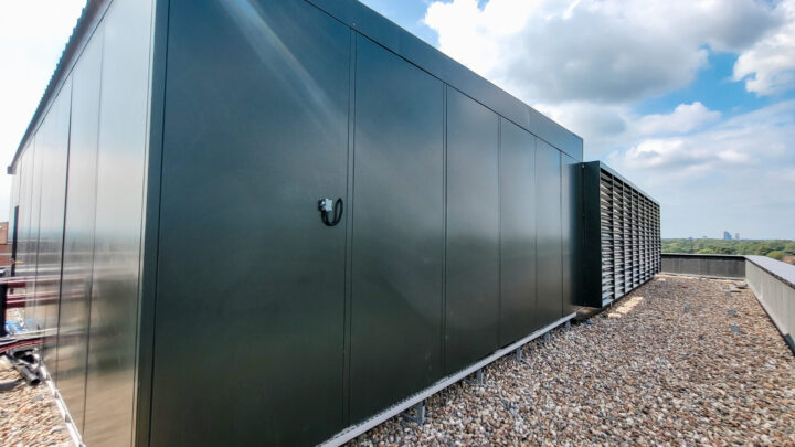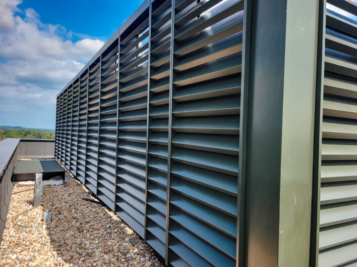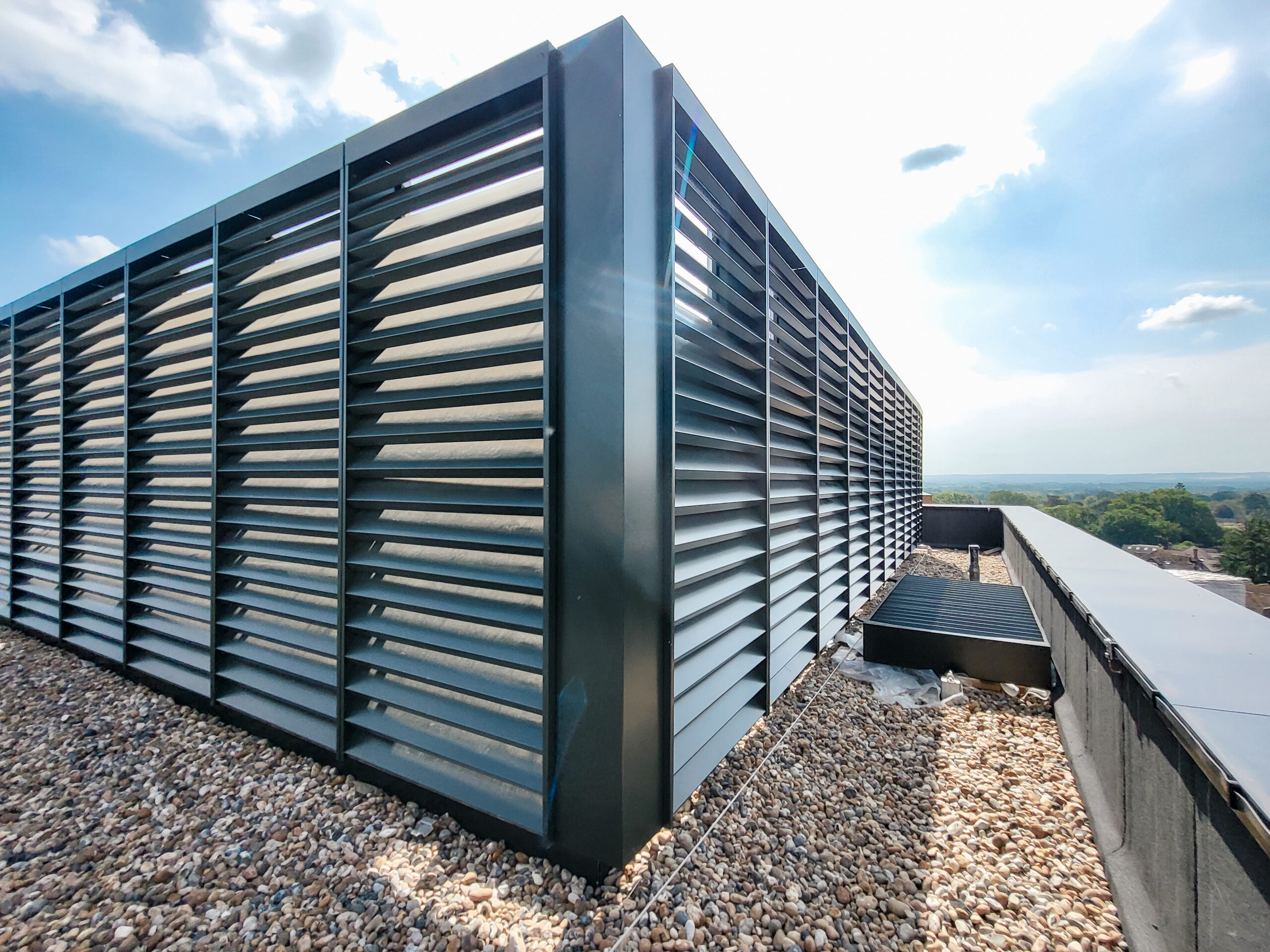 The plantroom featured our Flatscreen roof and a checker plate floor, creating a robust enclosure to shield sensitive equipment. Our Series 3 deck, constructed from lightweight yet durable aluminium, supported the installation of additional HVAC equipment while keeping overall roof loadings to a minimum. To enhance performance and appearance, the equipment was enclosed with our Peaceflow300 acoustic louvre screen system, which reduces noise levels, provides a clean visual finish, and maintains the necessary airflow for efficient operation.
